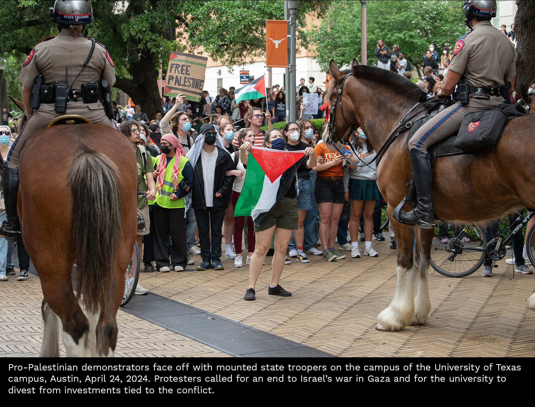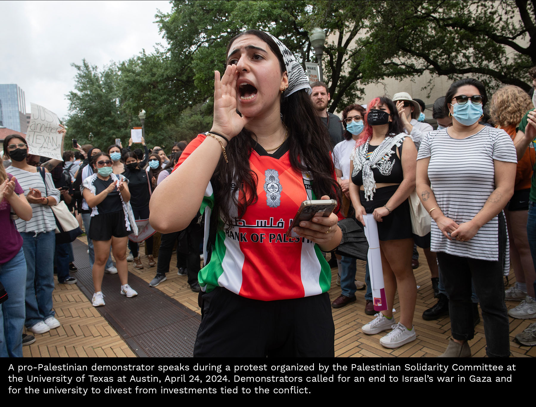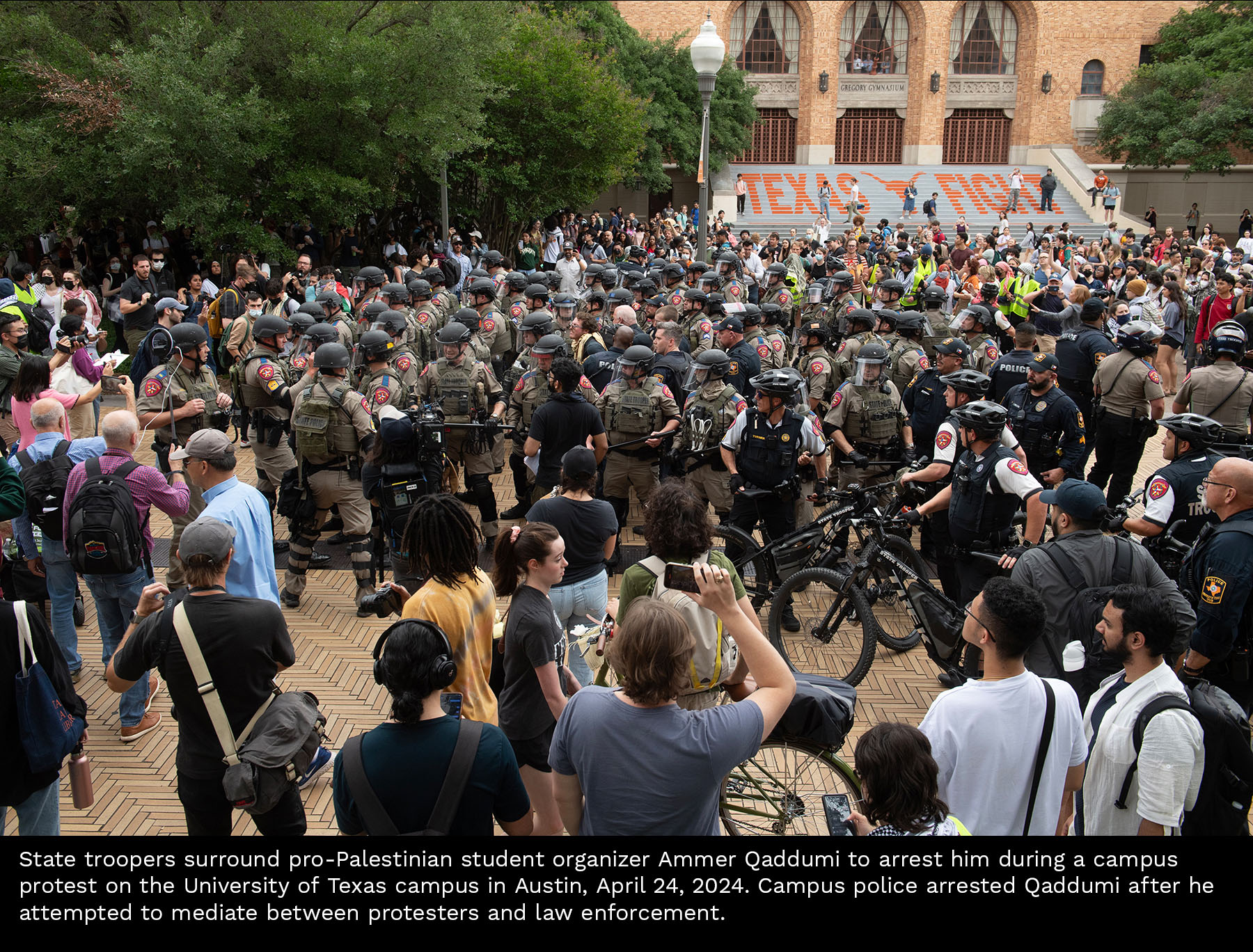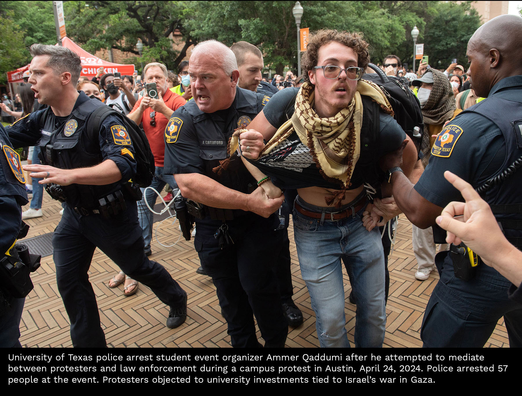Scenes from a Gaza divestment demonstration at the University of Texas on April 24, 2024. Select photos for captions.