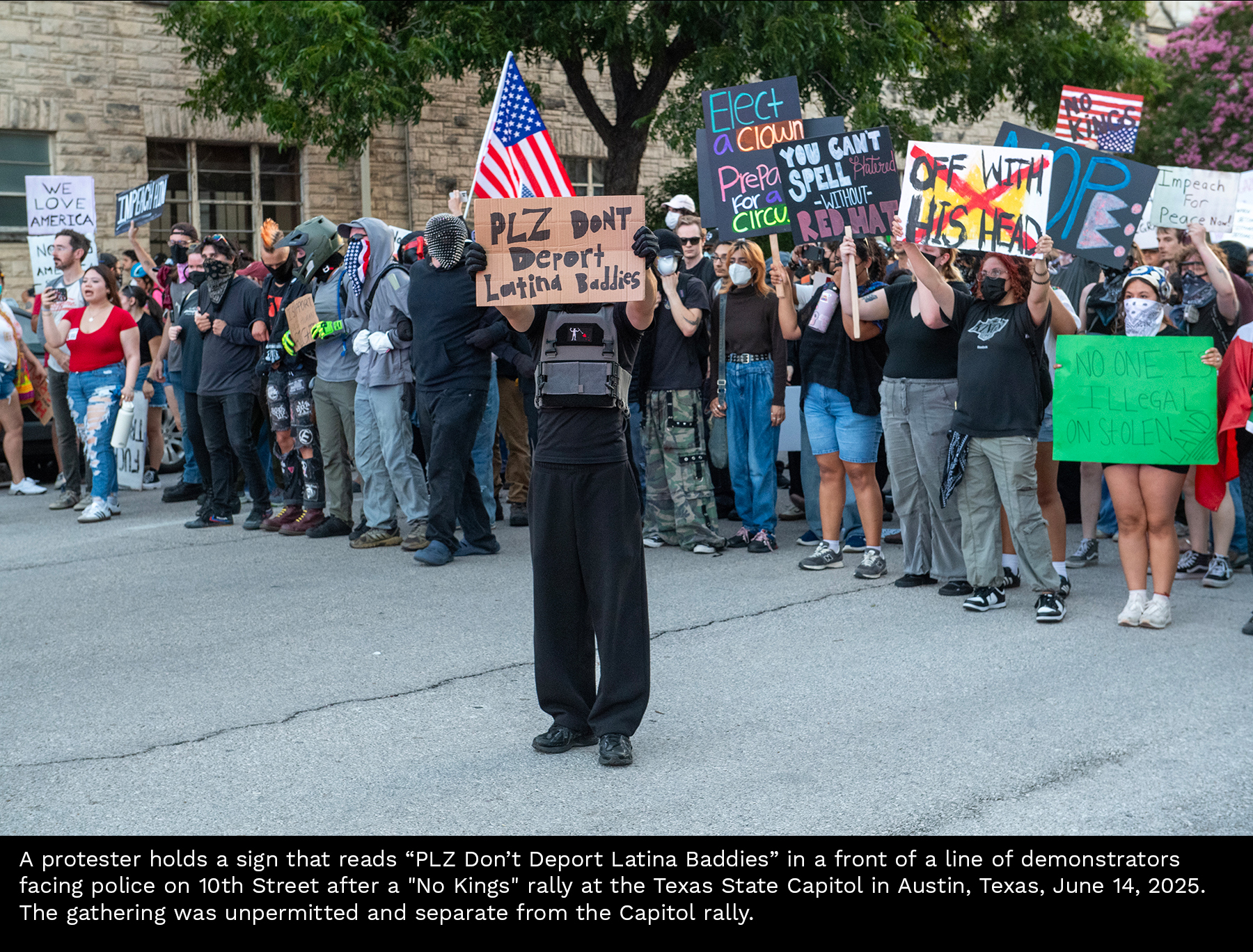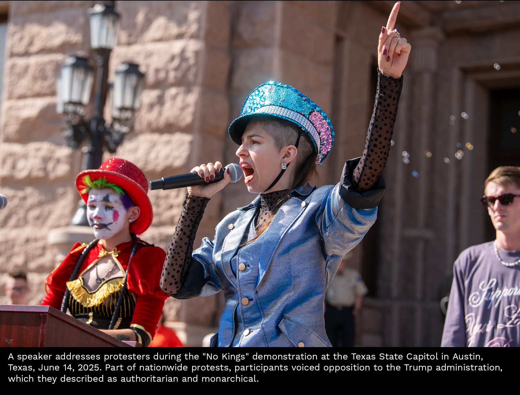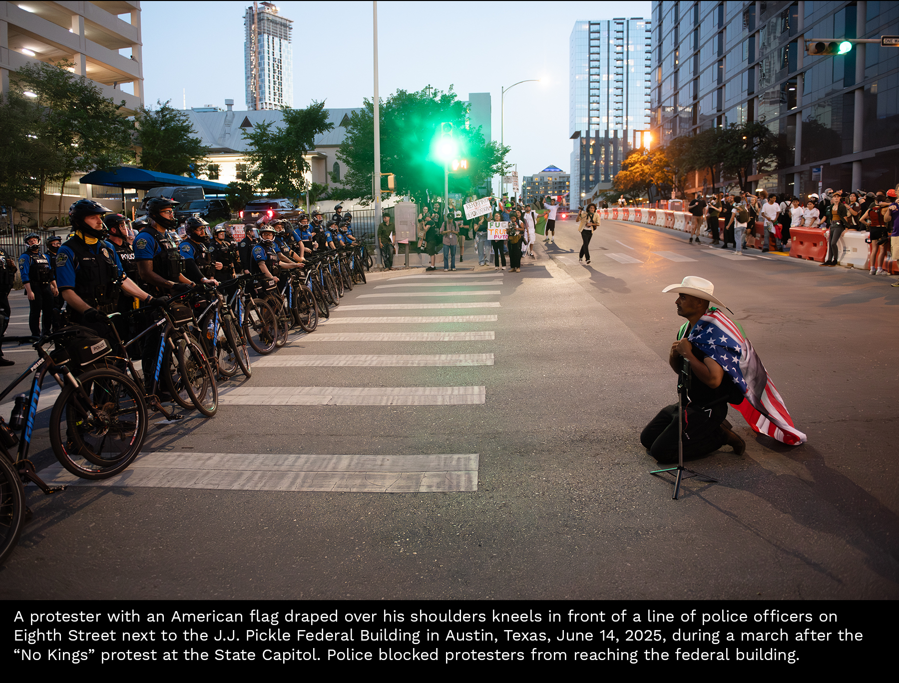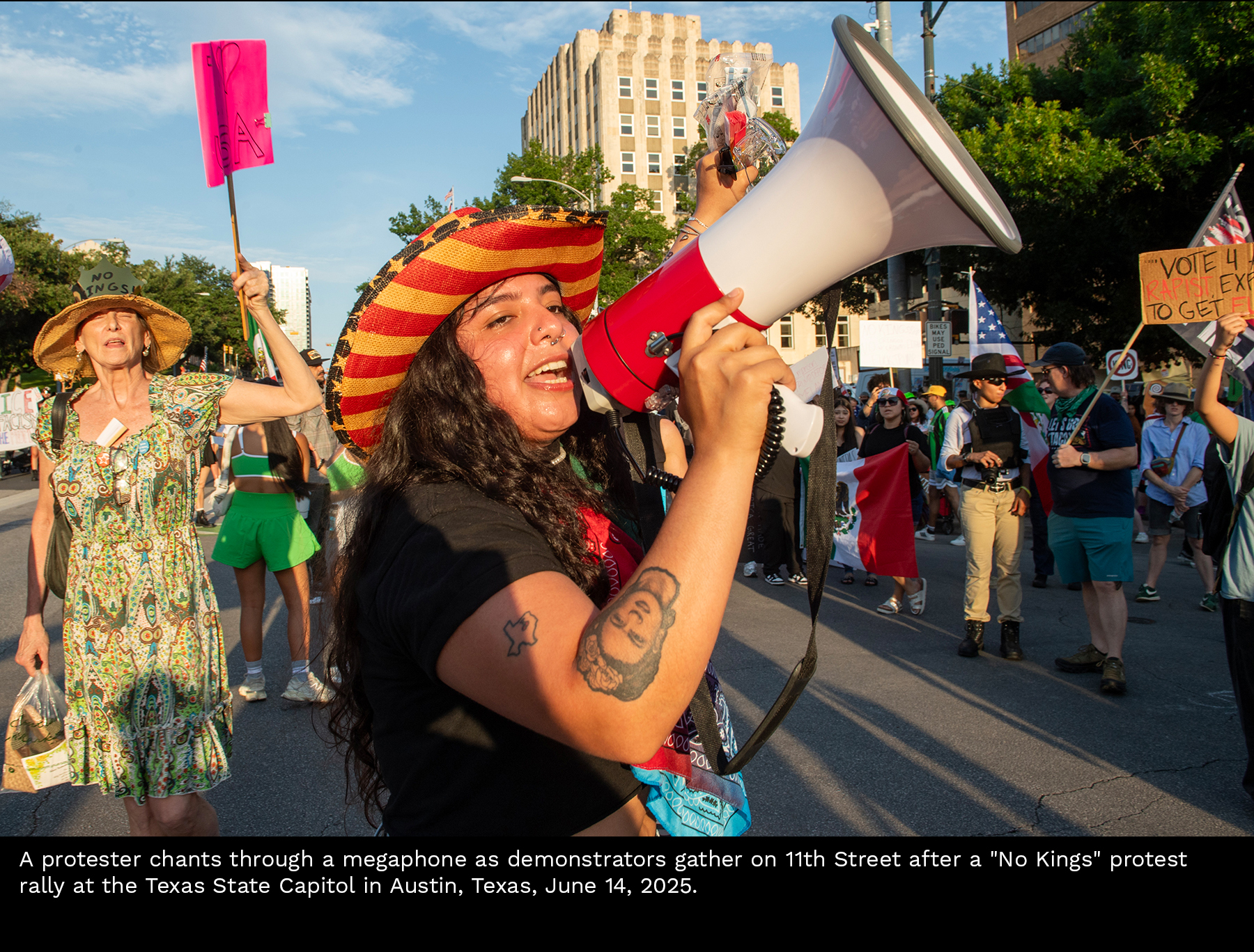 Scenes from the "No Kings" protest in Austin, Texas on June 14, 2025. Select photos for captions.